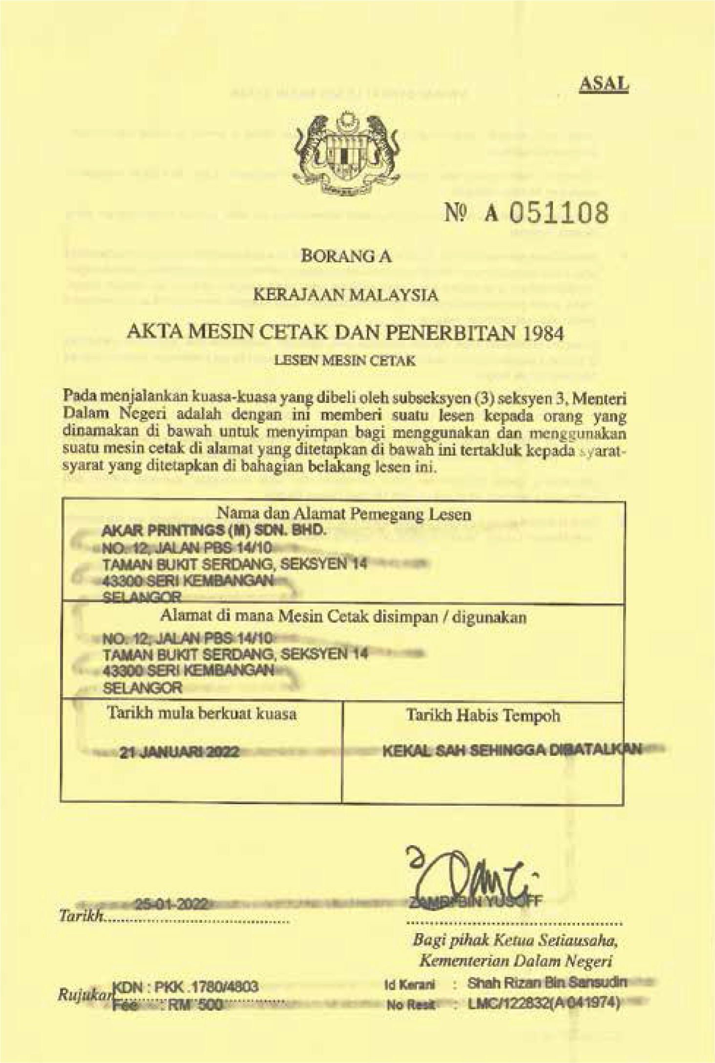 Akar Printings (M) Sdn Bhd is a wholly Bumiputera owned company registered under the business registration act 1965 which started operations in 2021.